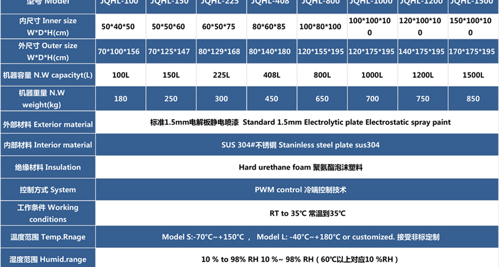 用途:高低溫試驗箱 JQHL-100L-1000L為電子、電工、儀表、零部件、材料等試驗樣品進行高溫、低溫、或者恒定試驗的溫度環境變化后的參數及性能測試。適用于汽車、航空、高校,專業實驗室研究開發