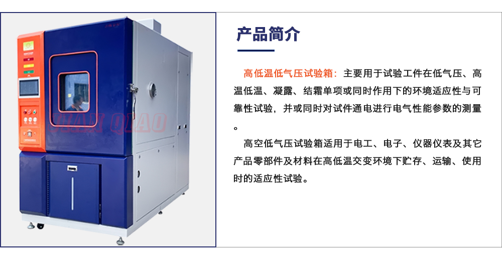 用途:高低溫低氣壓試驗箱:主要用于試驗工件在低氣壓、高溫低溫、凝露、結霜單項或同時作用下的環境適應性與可靠性試驗,并或同時對試件通電進行電氣性能參數的測量。